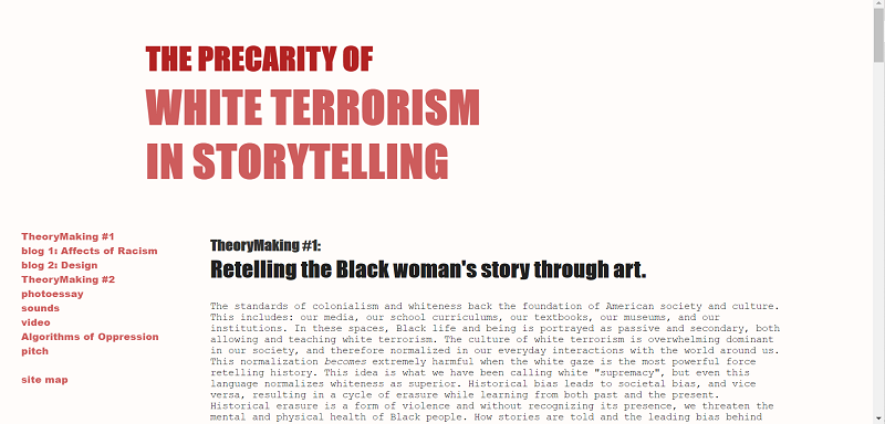 The webiste for The Precarity of Homogeneous Narratives in Storytelling follows the beginnings of my research on Black narratives and archival spaces. My first website features photoshop creations, audio edits and a featured video. The media featured on this site explores the power of narrative and informal knowledge gained through archival media. Historically, these narratives were created in opposition to the wellness of Black people.
